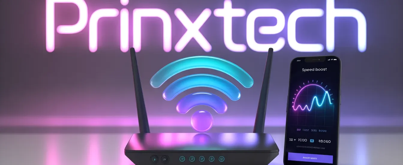 A modern home office environment featuring a sleek Router labeled "prinxtech" on a stylish wooden desk. In the foreground, a computer screen displays the settings page for changing the WiFi channel, with clear visuals of channel numbers and options highlighted. In the middle, a pair of hands professionally adjusting the settings via a mouse, suggesting action and engagement. In the background, a cozy atmosphere with soft artificial lighting, showcasing a minimalist decor with plants and bookshelves. The overall mood is focused and tech-savvy, portraying a sense of empowerment and modern living. The composition should have a balanced angle, capturing both the router and the user's interaction uniformly.
